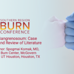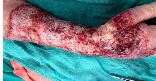 Presentation to Burn Unit : He subsequently presented to the burn center stating that his wound was worsening over the past month, and he could not tolerate the wound care due to severe pain. Pt was septic and hypotensive with necrotic open wound to R arm/ forearm and leukocytosis (Figure 1). He was taken emergently to the operating room for debridement and source control, and was admitted to the ICU for further management including local wound care and antibiotic treatment (Figure 2). Punch biopsy was obtained which was consistent with the diagnosis of pyoderma gangrenosum.