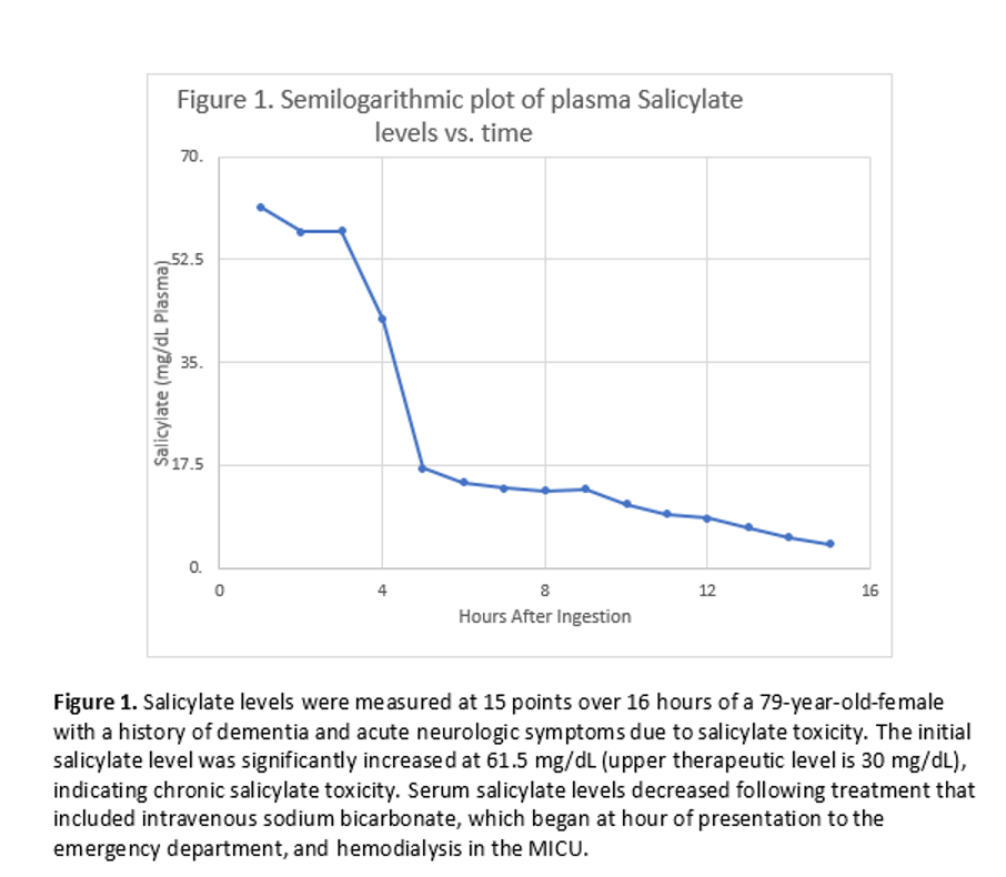 Management/Outcome/Follow-up: In the emergency department, poison control was consulted, and the patient was started initially on intravenous sodium bicarbonate 1-2 mEQ bolus, followed by 150 mEq of bicarbonate mixed with of one liter of D5W. This was run at 250mL/hr. Since this was not an acute ingestion, activated charcoal was not indicated. In the medical intensive care unit, she had potassium replacement and acute hemodialysis, with the bicarb drip continuing at declining rates over the next several hours. Her serum salicylate level continued to trend down to