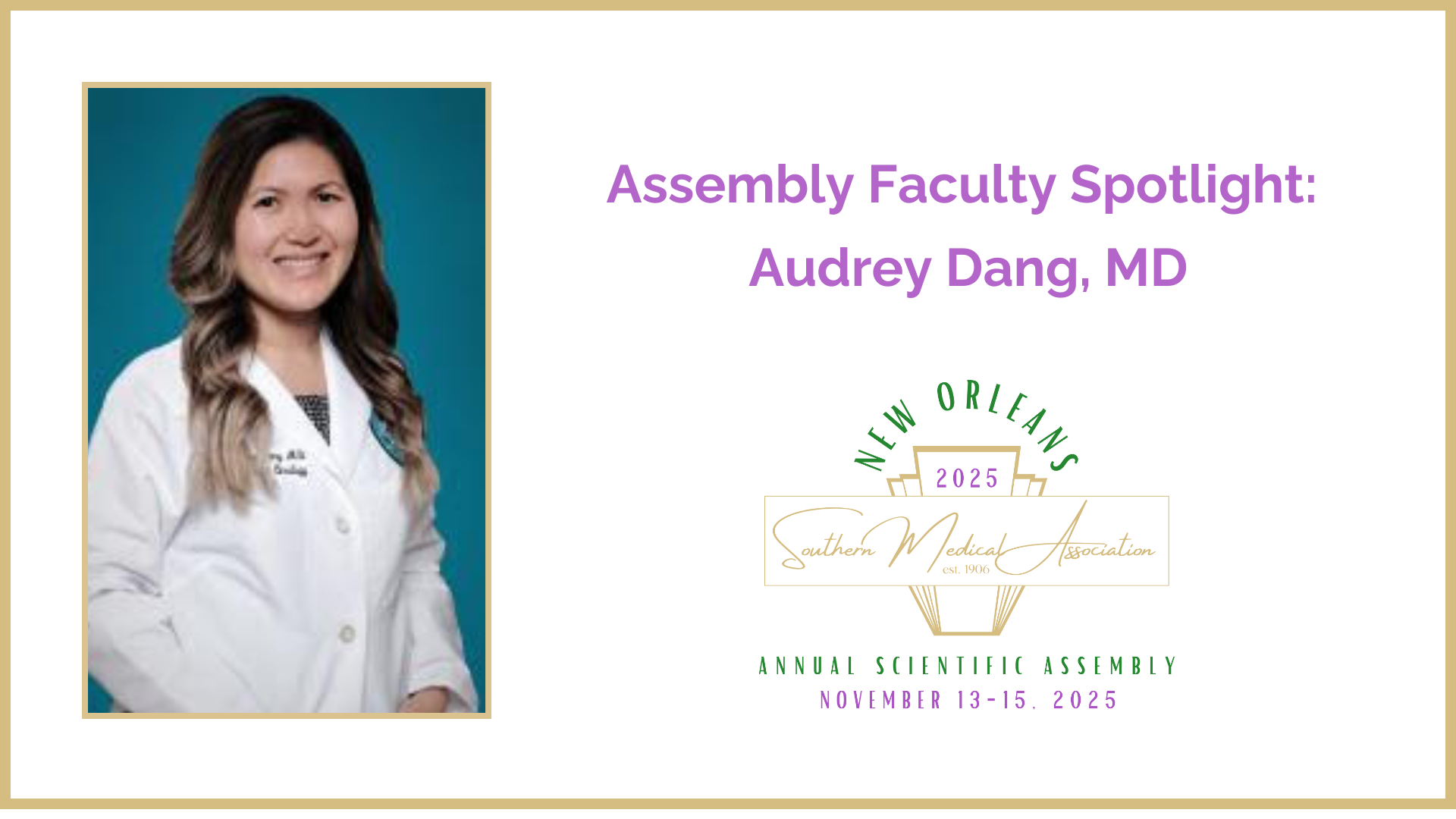 The Southern Medical Association (SMA) is proud to feature Audrey Dang, MD, as a speaker for the Association's 117th Annual Scientific Assembly taking place November 13-15, 2025 in New Orleans.