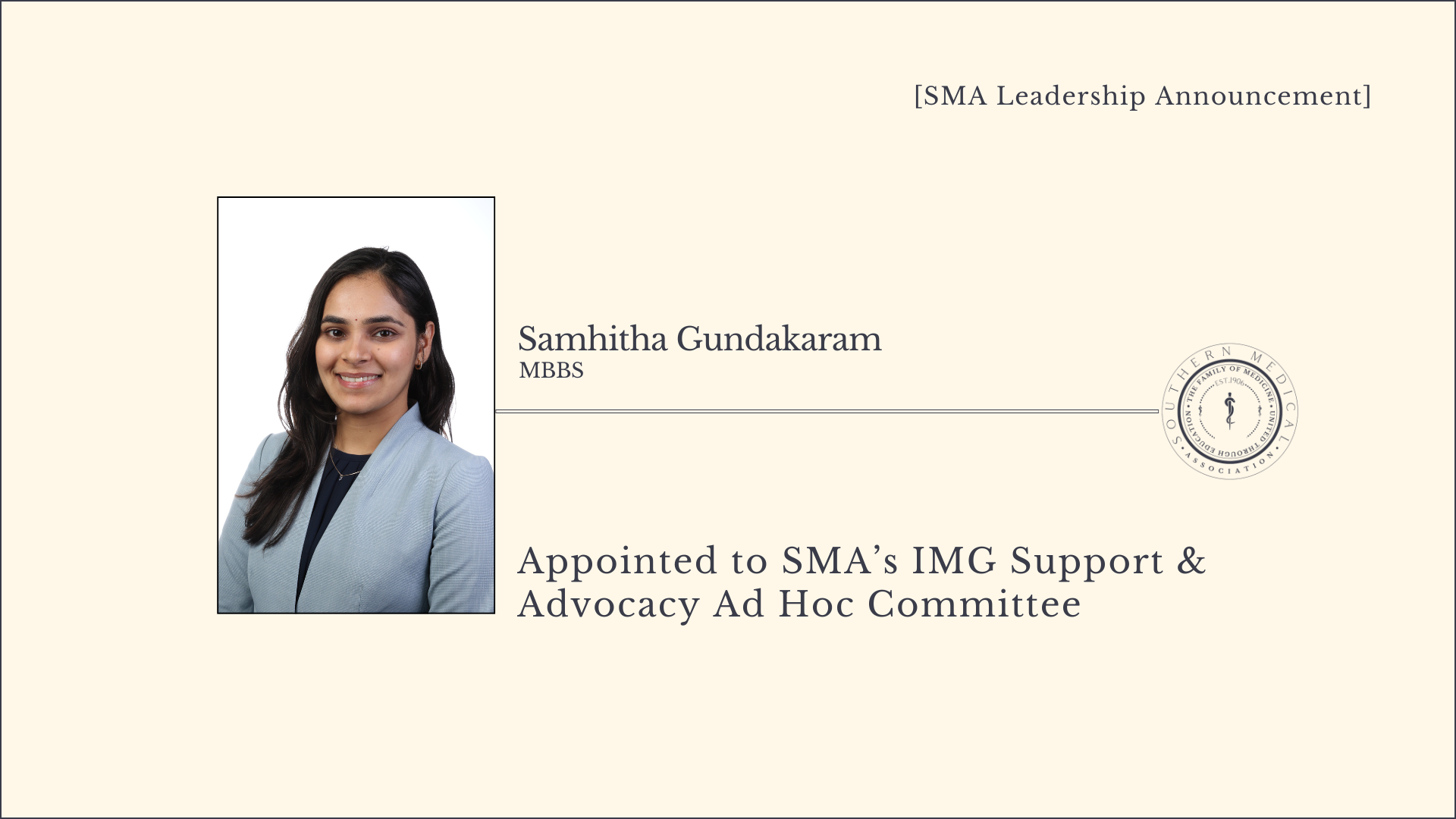 The Southern Medical Association (SMA) is pleased to announce Samhitha Gundakaram, MBBS, has been appointed to the newly formed International Medical Graduate (IMG) Support & Advocacy Ad Hoc Committee.